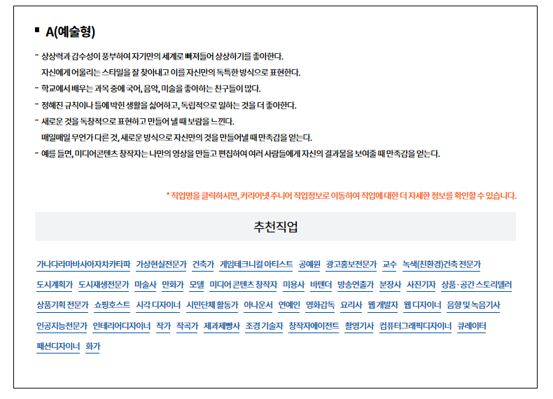 추천직업에 나와있는 직업명을 클릭하면 그 직업에 대해서 좀 더 상세히 볼수 있어서 직업에 대한 이해도 높일수 있는거 같아요.