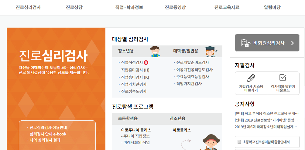 오른쪽에 나와있는 대상별 심리검사에는 청소년용과 대학생, 일반인도 나와있어 미리 직업이 있는 저도 지금 잘하고 있는지 맞는 직업군인지 한번 생각해보게 되더라구요.