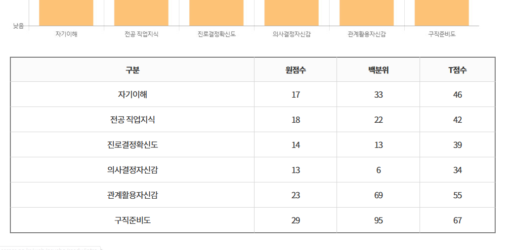 진로목표 달성을 위해 필요한 사항들에 대한 준비 정도와 직업과 관련된 다양한 가치 중, 어떤 가치를 주요하게 만족시키고 싶은지알아볼 수도 있더라구요.