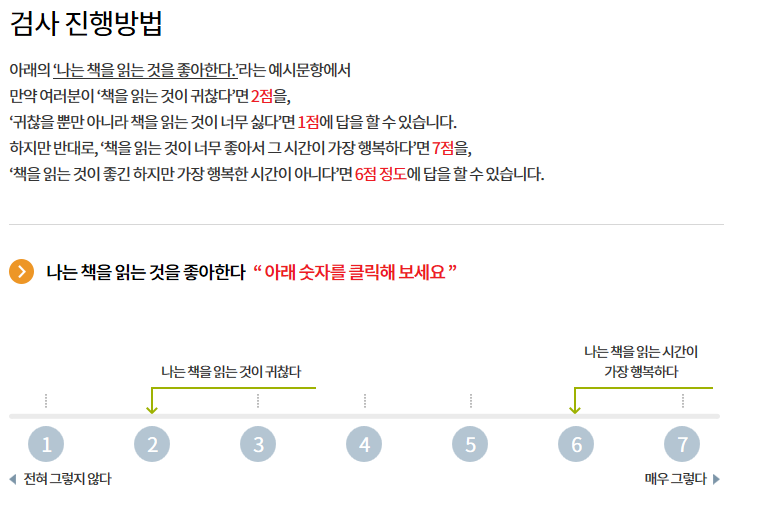 진로흥미탐색검사는 어떤 분야에 흥미가 있는지 알 수 있는 검사로 평소에 쉽게 접할 수 있는 활동이나 행동 예시를 주고 학생 자신에게 맞는 점수를 1~7사이의 번호를 선택하여 결과를 알 수 있어요.