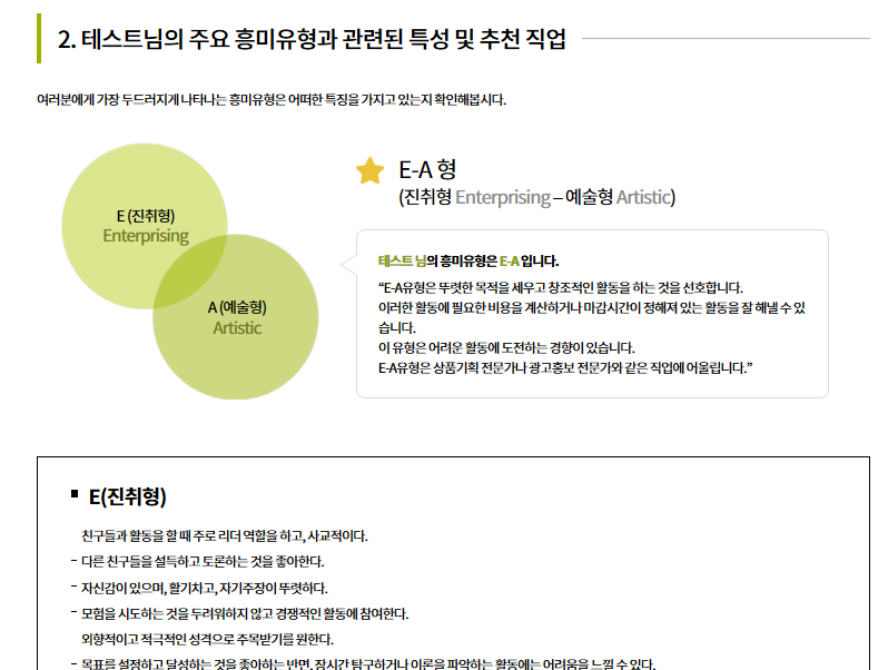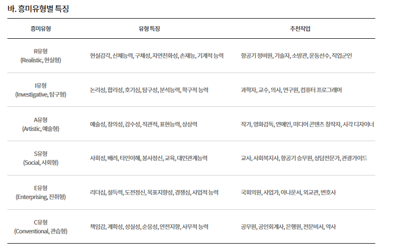 그 중 상대적으로 높은 흥미를 보이는 유형에 따른 특징, 추천직업과 학습법 등이 제공되요.