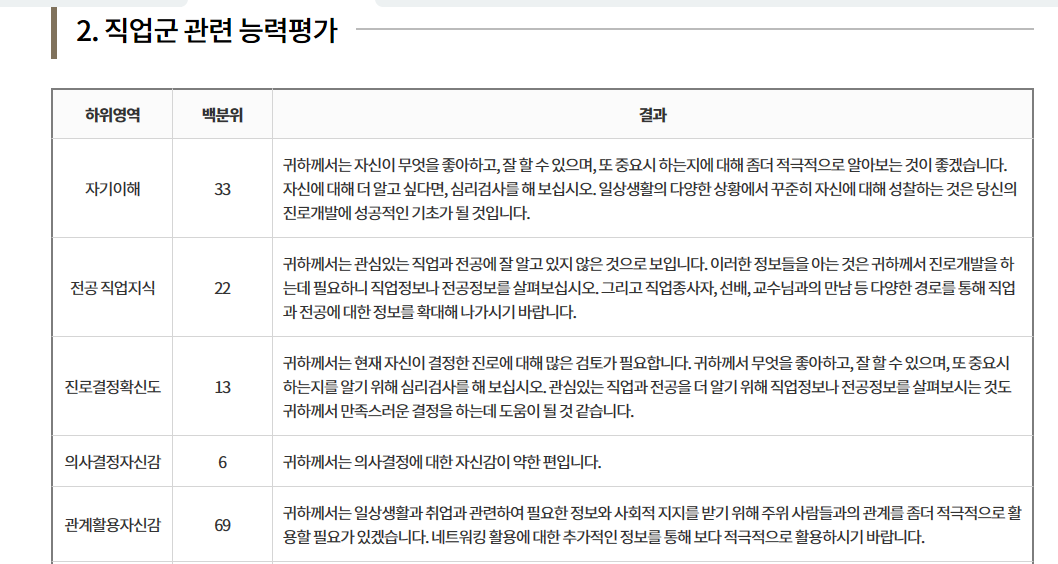 결과표에는 6개 흥미유형별 점수가 나타나고