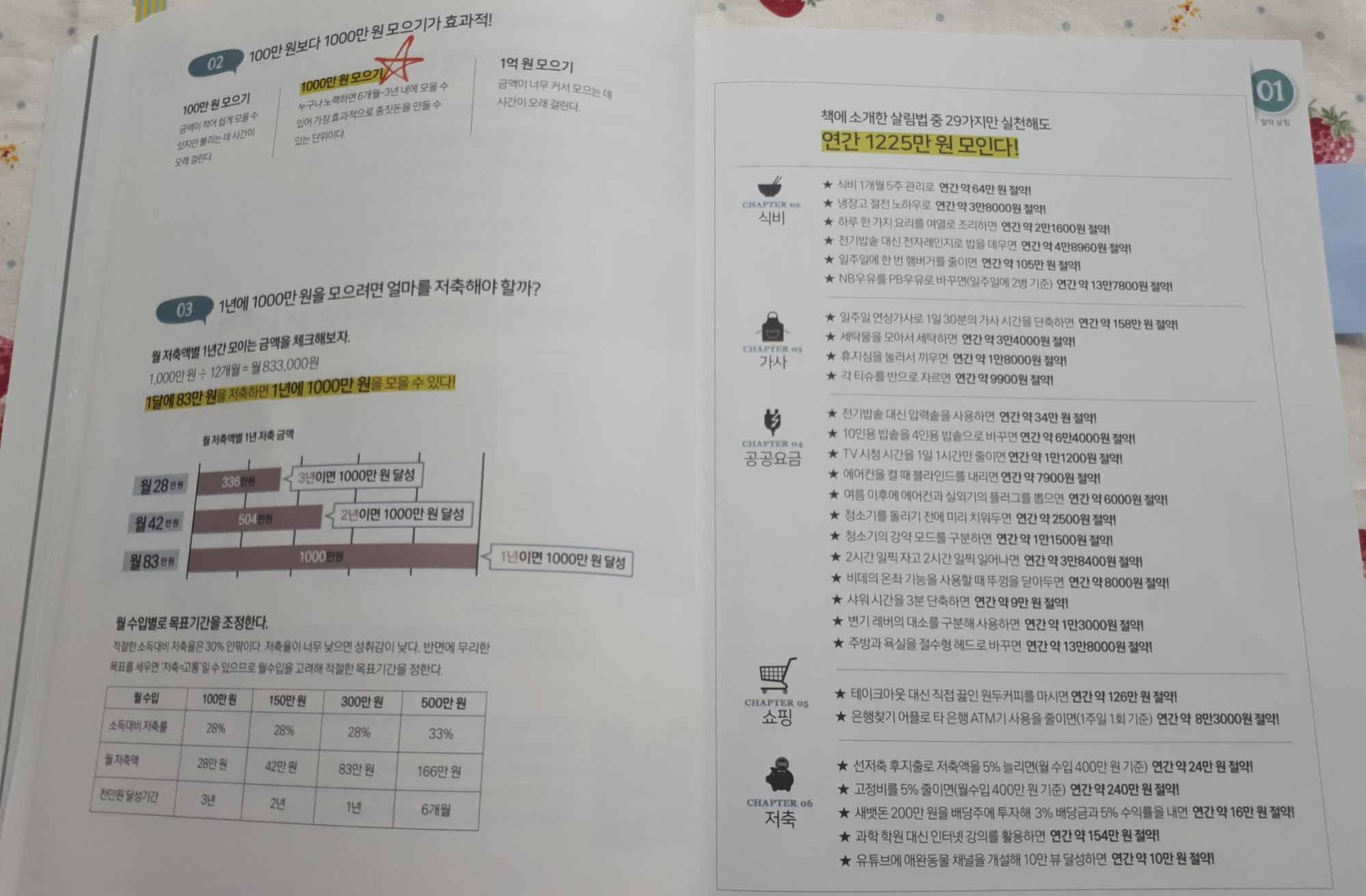 오른쪽 페이지에 이 책을 읽어보시면 더 이해가 되시겠지만 소개 된 방법들로 실천하면 연간 1225만원이 모인다는 표예요~