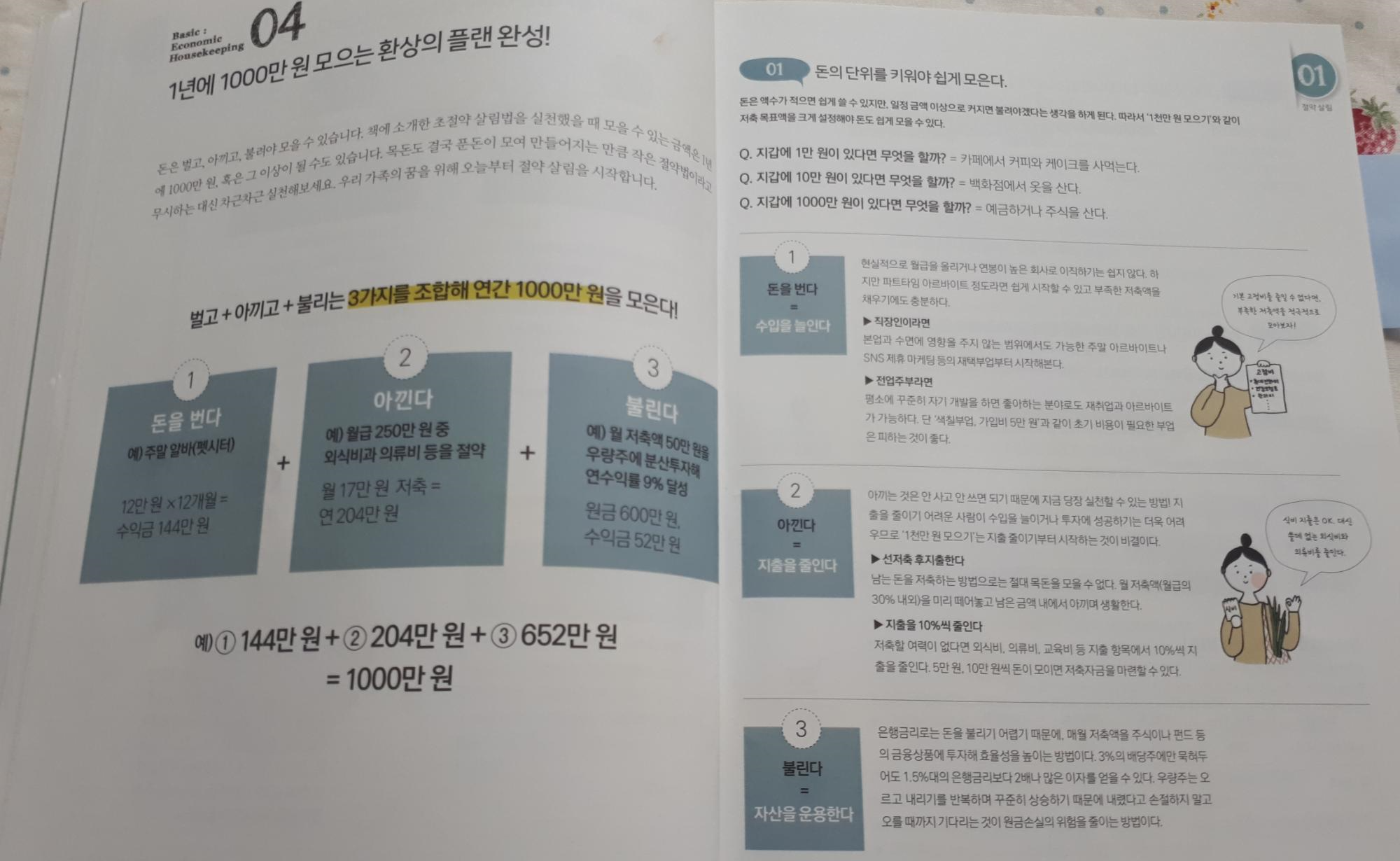얼마나 마른 행주를 쥐어짜야 될까?...이렇게만 생각했는데 아끼는 건 1가지 방법일 뿐이고 부가수입을 벌고 그 돈을 불린다는 방법이 제시되어있요~
