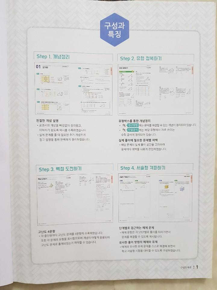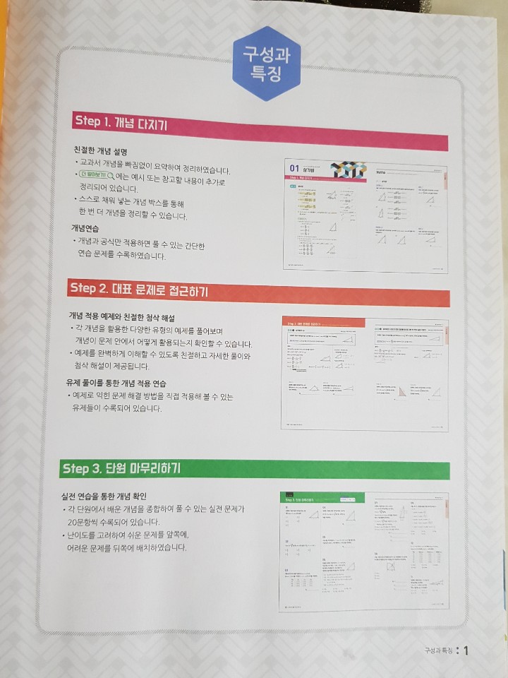 뜀틀의 단계처럼 1,2,3 단계로 step 1에서는 개념을 다지고 Step 2에서는 개념의 대표문제들을 다루고 Step3 에서 단원을 마무리해요.